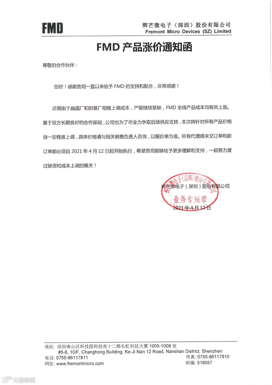 4月12日,国内MCU厂商辉芒微电子(FMD)发布产品涨价通知函,全线产品价格上涨。