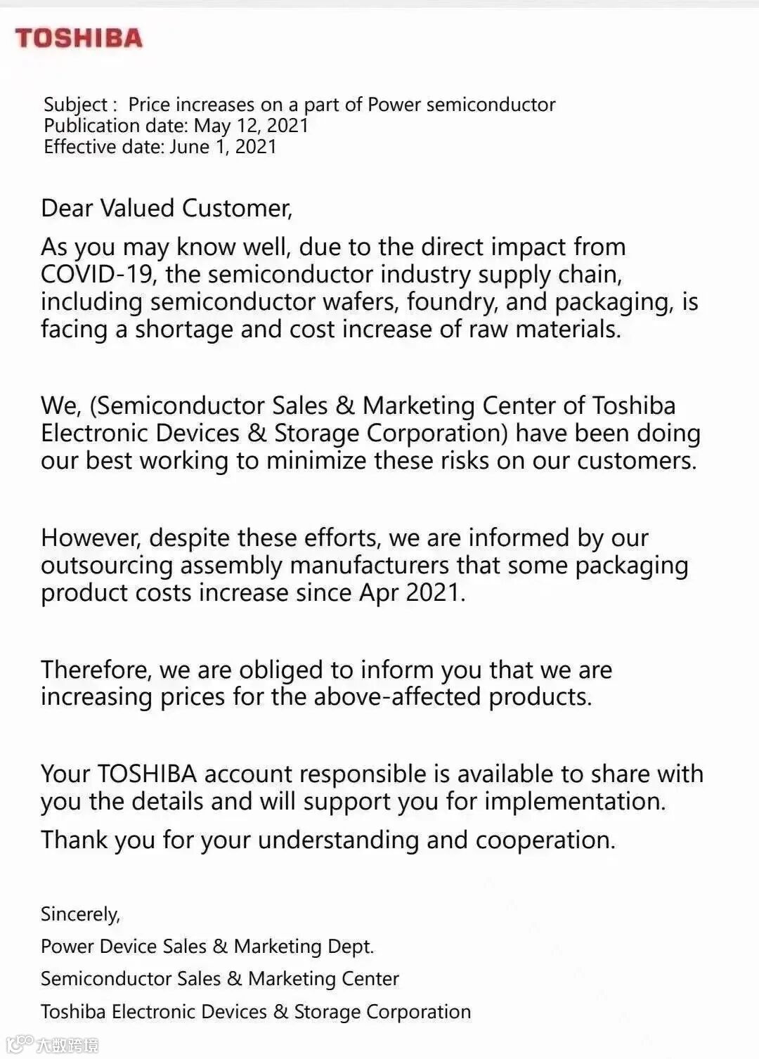 5月12日,TOSHIBA(东芝)向客户发布了调涨通知,通知表示,由于受到新冠肺炎的影响,半导体晶圆、代工和封装,都面临原材料短缺和成本增加的问题,东芝的产品成本也在不断增加,因此,决定于2021年6月1日提高产品的价格。
