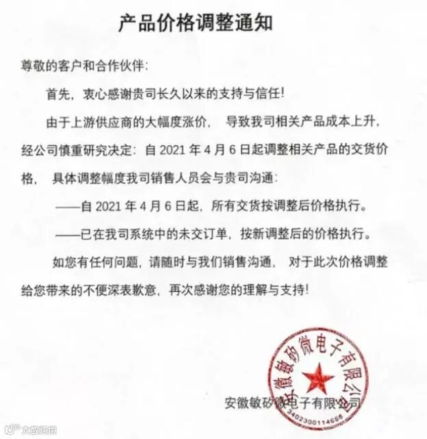 敏矽微通知表示,自2021年4月6日起,所有交货按调整后价格执行。已在系统中的未交订单,按新调整后的价格执行。