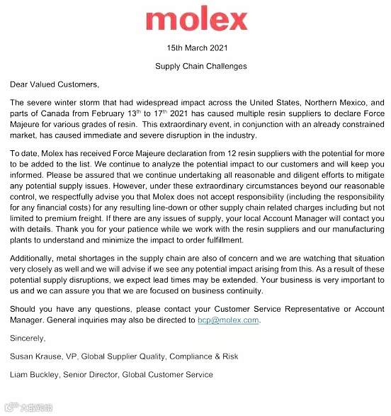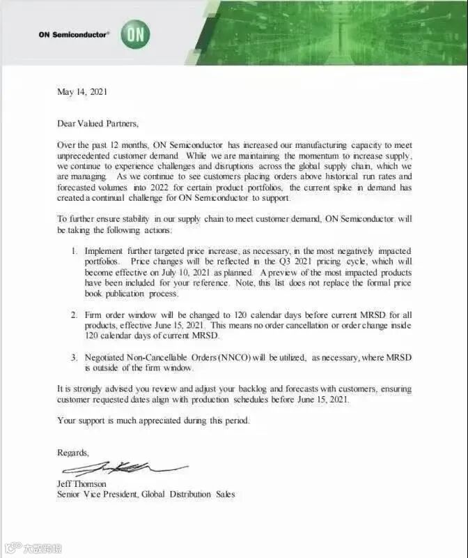 5月14日,安森美在涨价通知函中表示,由于客户下的订单超过历史订单,当前的需求高峰给公司带来了挑战,所以不得不在2021年第三季度上调产品价格。具体涨价执行日期是7月10日。