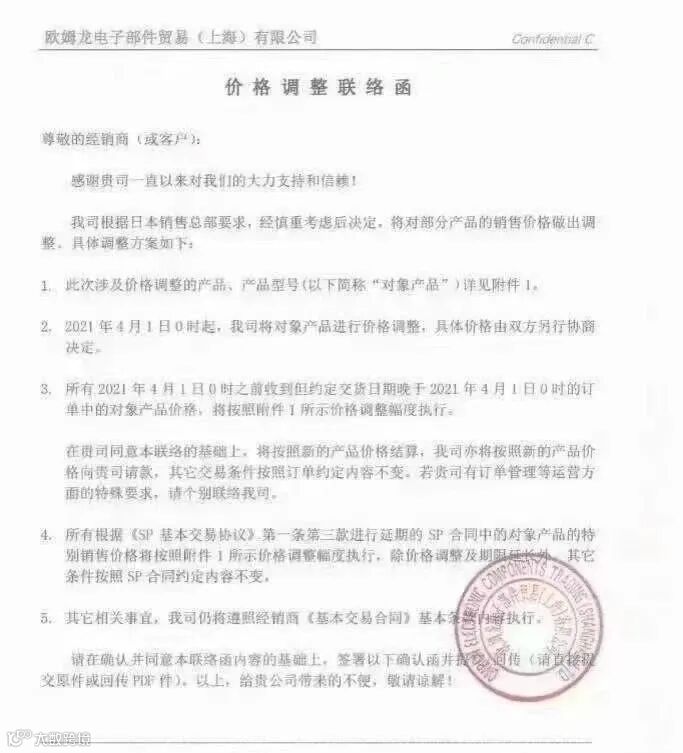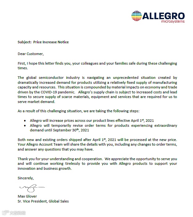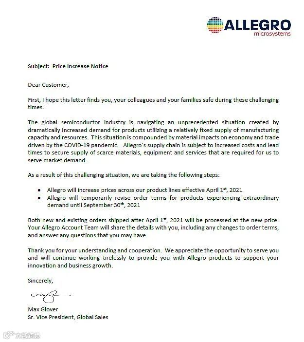 美国Allegro 公司涨价函显示:2021年4月1日后出货的新订单,和现有的订单,都将按照上涨后的新价格执行销售。