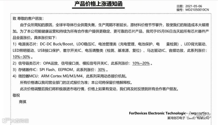 5月6日,富鸿创芯发布产品价格上涨通知函表示,由于众所周知的原因,全球半导体行业供需失衡,生产周期不断延长,原材料价格节节攀升,致使公司的制造成本大幅增加。