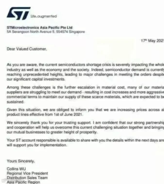 5月17日,意法半导体ST发出通知,称将于6月1起对全线产品涨价。涨价通知显示,目前半导体的缺货情况严重影响了产业链。