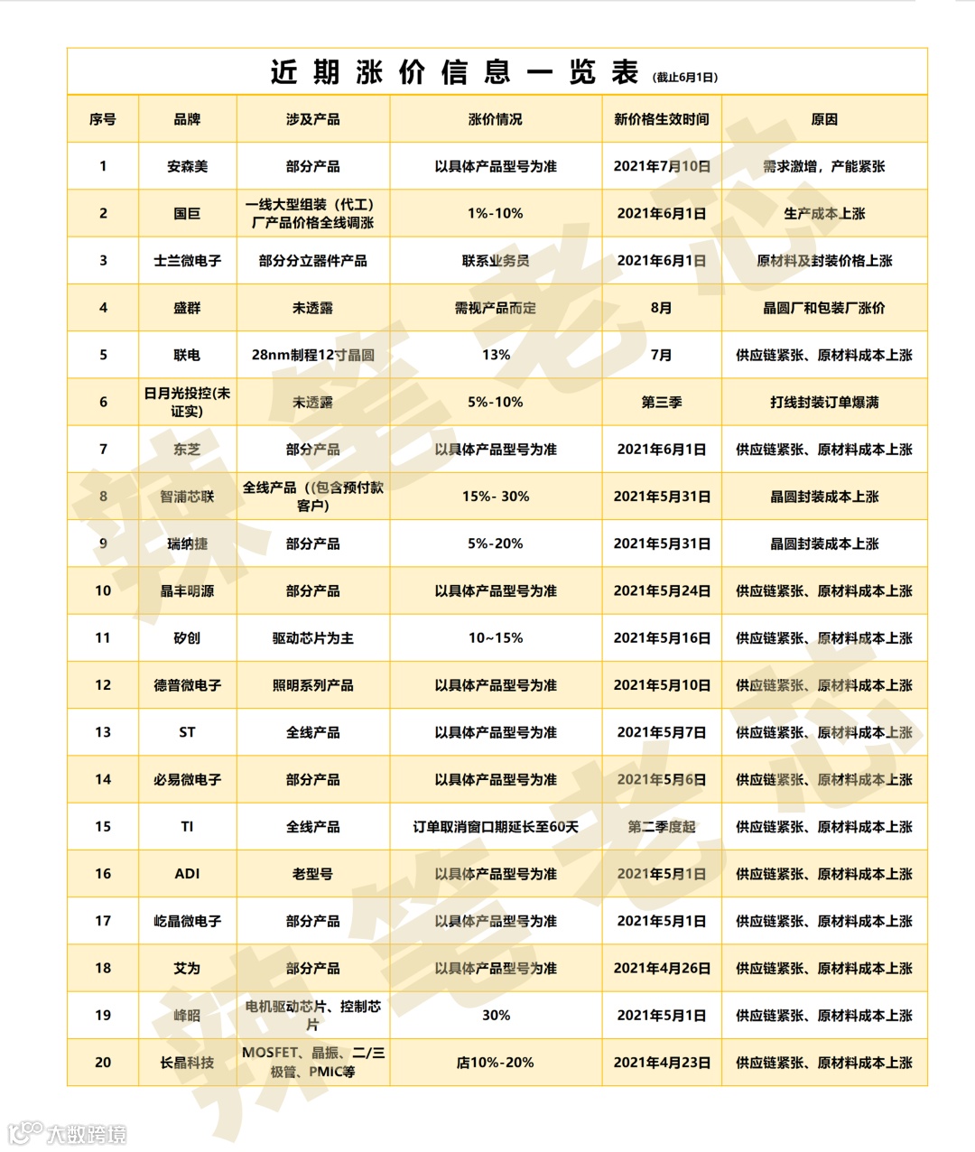 随着供应链情况日益紧张、原材料资源紧缺且费用大幅上涨、投产周期长等因素影响,多家厂商又发布了涨价通知,小编汇总统计约近60家芯片厂商涨价,更多涨价函来袭中!