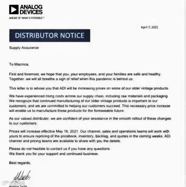 4月7日,全球模拟芯片巨头ADI(亚德诺)邮件通知代理商,将对部分产品调涨出货价格,新价格将于5月16日生效。