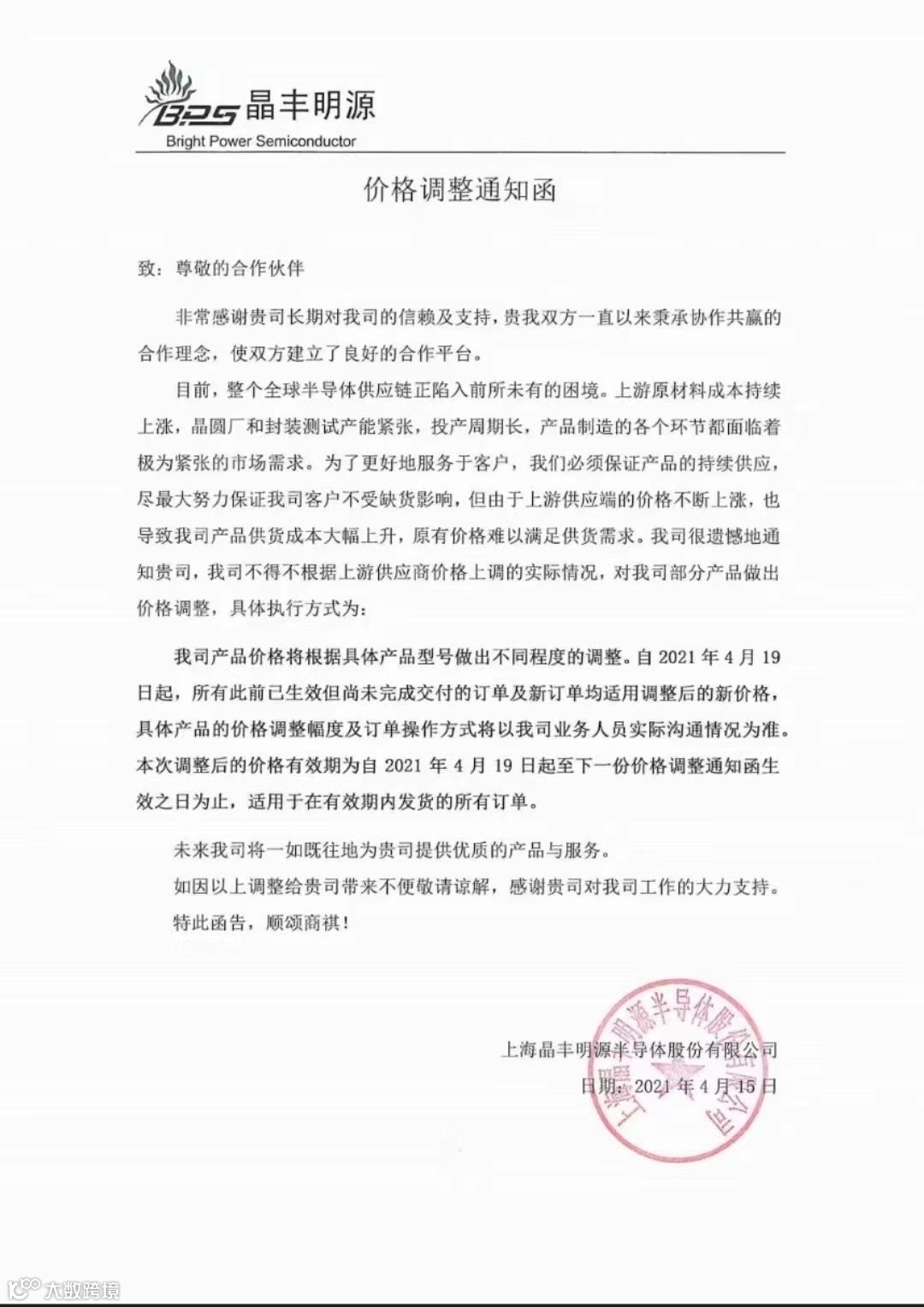 4月15日,晶丰明源对外发布价格调整函表示,自2021年4月19日起,所有此前已生效但尚未完全交付的订单及新订单均适用调整后的新价格,本次调整后的价格有效期为2021年4月19日起至下一份价格调整通知函生效之日为止,适用于有效期内发货的所有订单。