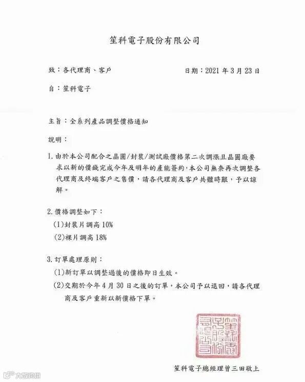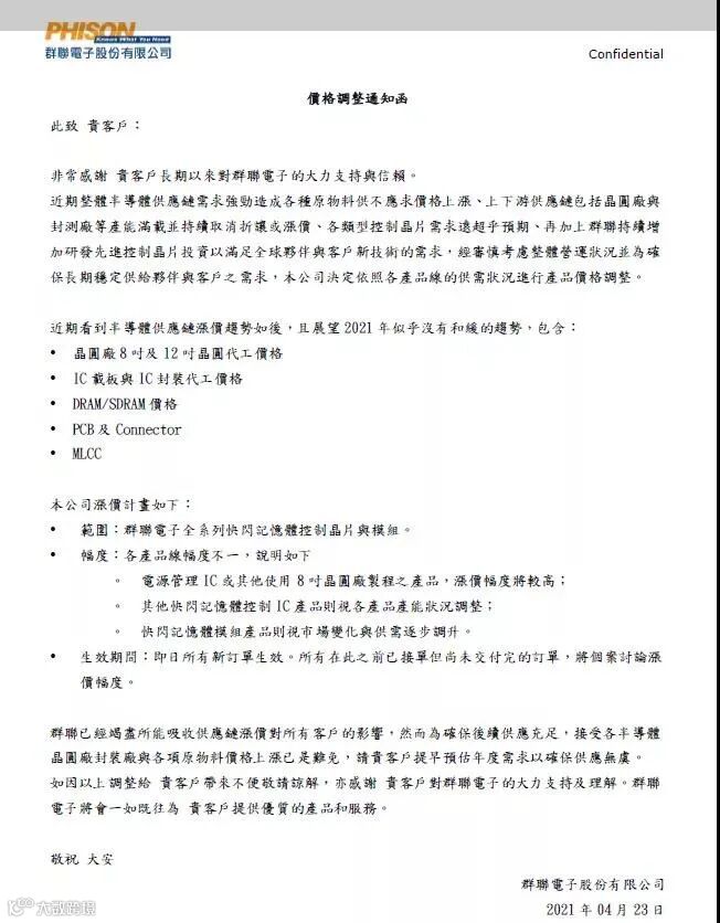 4月23日,NAND Flash控制IC厂群联对客户发出涨价通知,即日起调涨全系列快闪存储控制芯片和模组价格,各产品线涨幅不同,通知原文如下: