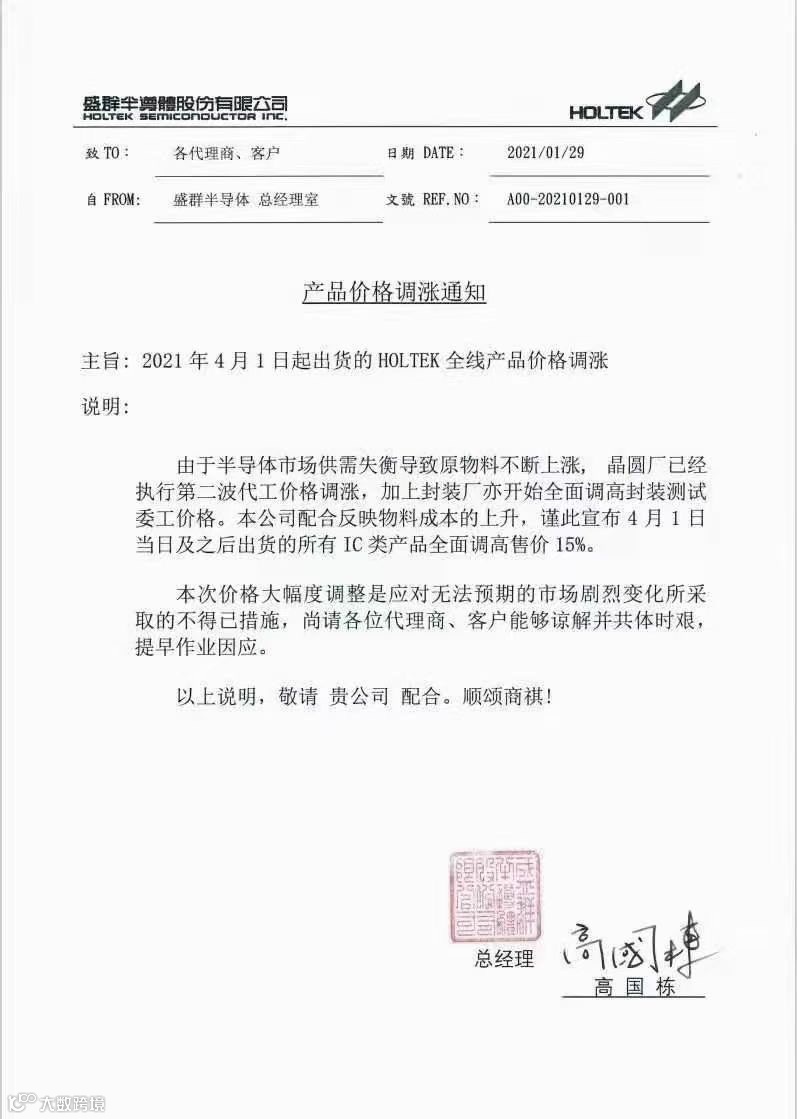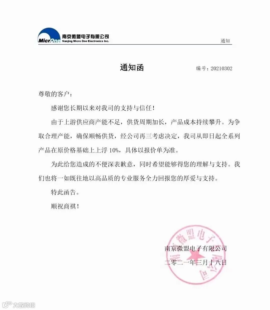 辉芒微电子在通知函中表示,本次将针对所有产品价格做一定程度上调,具体价格请与相关销售负责人咨询,以报价单为准。所有代理商未交订单和新订单都必须自2021年4月12日起开始执行。