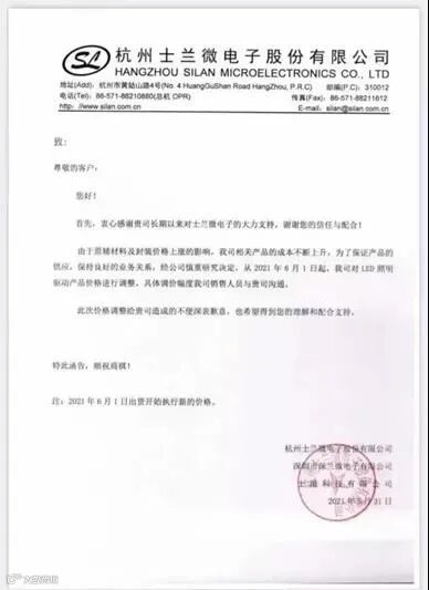5月31日,杭州士兰微电子股份有限公司下发涨价通知函,由于原辅材料及封装价格上涨的影响,公司相关产品的成本不断上升。