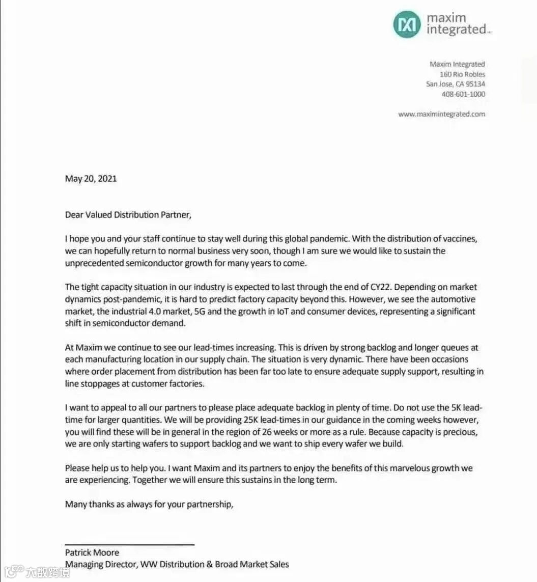 5月20日, Maxim(美信)向合作分销商发布了通知,通知表示,由于汽车、5G、物联网和消费类设备的增长,半导体行业将迎来前所未有的增长。然而受新冠肺炎影响,半导体行业的产能紧缺,导致产品交期拉长。