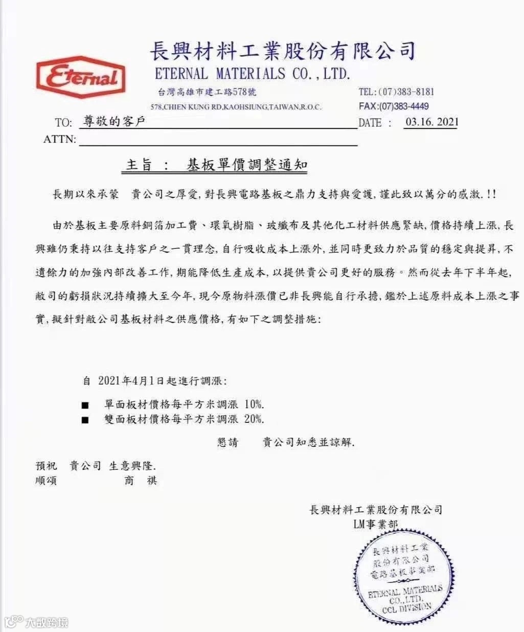 长兴材料工业股份有限公司基板单价调整通知显示,由于基板主要原料铜箔加工费、环氧树脂、玻纤布及其他化工材料供应紧缺,价格持续上涨,鉴于上述原料成本上涨之事实,拟针对公司基板材料的供应价格调整如下:单面板材价格每平方米调涨10%;双面板材价格每平方米调涨20%,自2021年4月1日起进行调涨。