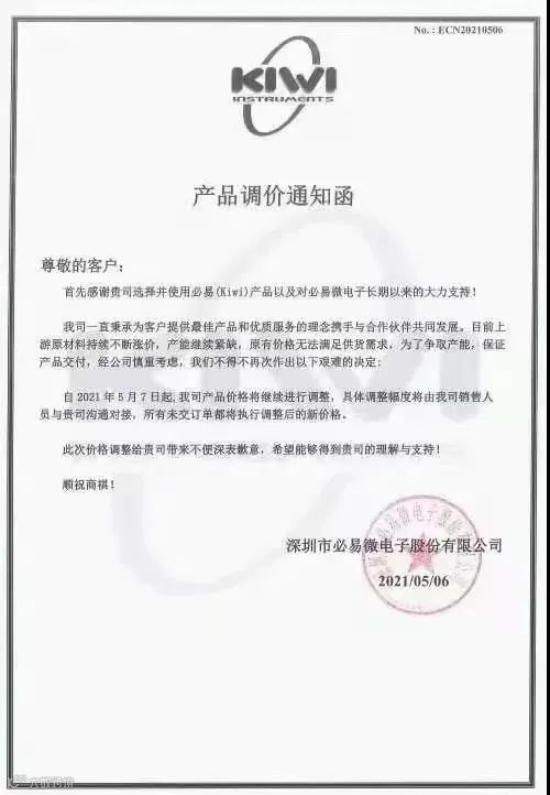 5月6日,驱动IC原厂深圳市必易微电子股份有限公司发布产品调价通知函,目前由于上游原材料持续不断涨价,产能继续紧缺,原有价格无法满足供货需求,为了争取产能,保证产品交付,经公司慎重考虑决定: