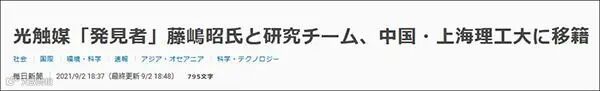据日本主流媒体《每日新闻》9月2日报道,“光催化”领域权威人物、数次获诺贝尔奖提名的日本著名科学家、中国工程院外籍院士藤岛昭已带领他的研究团队全职加盟上海理工大学。报道提到,藤岛昭也是“光触媒”的发现者。