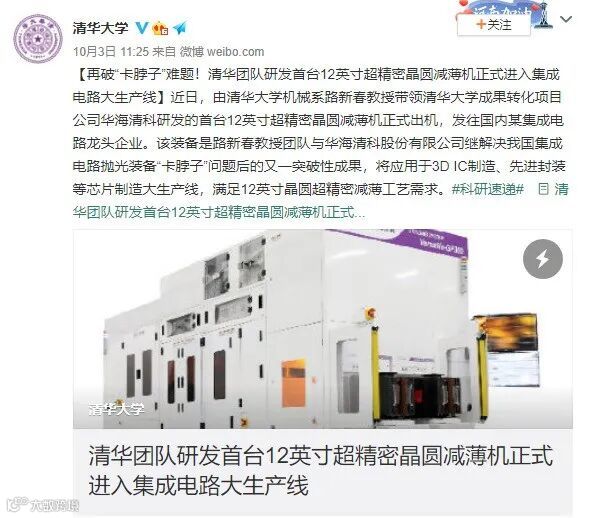 据清华大学官方消息,近日,由清华大学机械系路新春教授带领清华大学成果转化项目公司华海清科研发的首台12英寸(300mm)超精密晶圆减薄机,已经正式出货,发往国内某集成电路龙头企业!