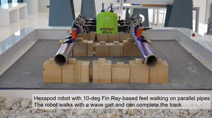 研究人员将鱼鳍结构的脚安装在Kniese六足机器人上,让它在两根圆形管道上走钢丝,并将其与传统的机器人脚对比,带有10度横梁脚部设计可以显著增加脚与管道上的接触面积,有点像“抓”着管道走,又快又稳。