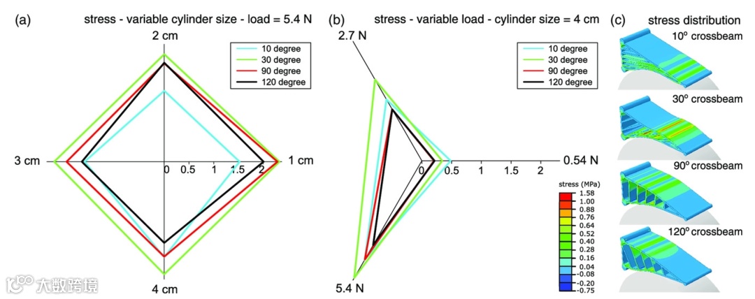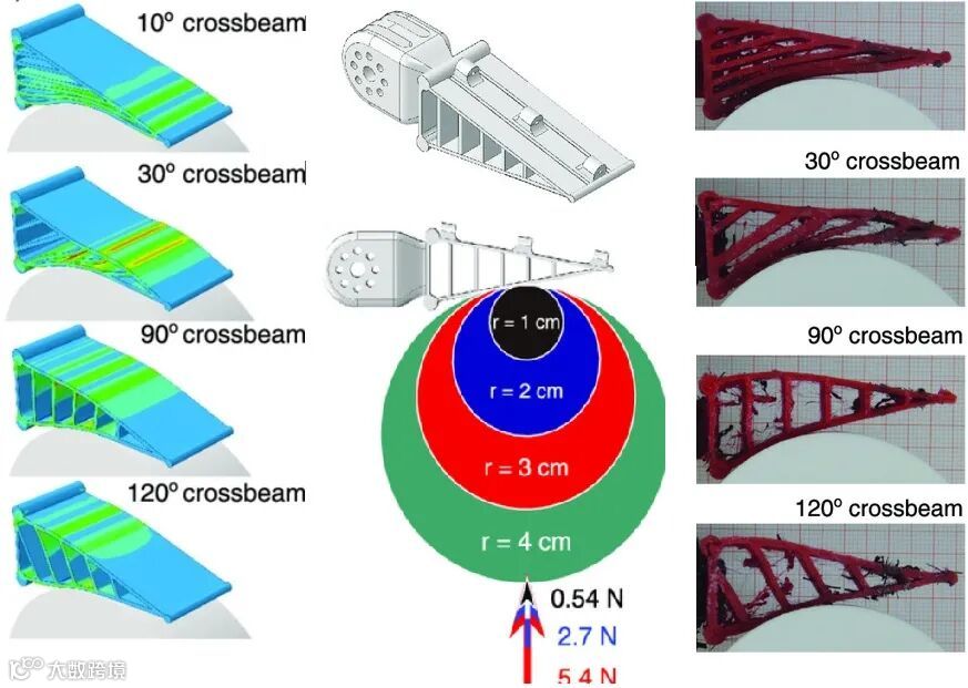 鱼鳍结构内的横向骨架通常为90度,研究人员将其改变为10度、30度、120度,并研究不同角度会对其应力及变形能力的影响。