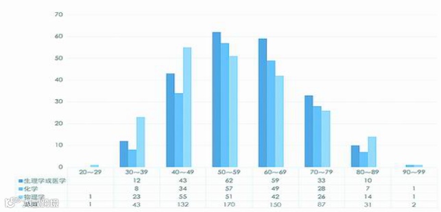 本文选取诺贝尔奖在生理学或医学、化学以及物理学奖项上获奖人数年龄值,并将其分为8个不同年龄段,以获知诺贝尔获奖者年龄差异情况。