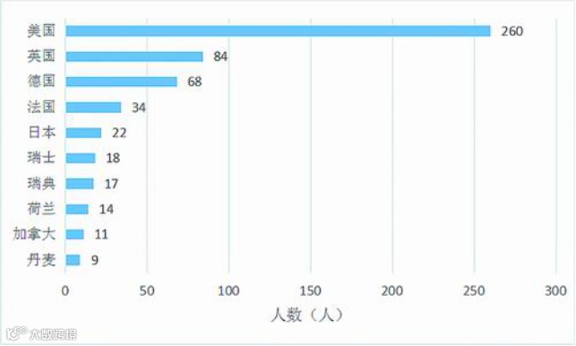 以获奖者获奖时的国籍统计,图1展示了人数排名前十的国家。(注:为不造成人数误差,此处不计算11名拥有双重国籍的获奖者)