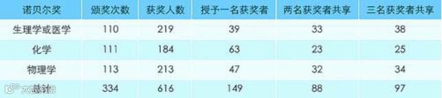 从1901年到2019年,诺贝尔奖在自然科学领域共颁奖334次,共有616位获奖者(详见表1)。