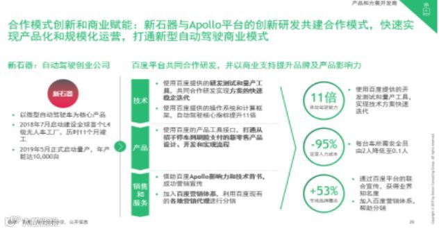 以新石器为例,通过与Apollo开放平台的合作,其技术方案迭代提速了11倍,每台车所需安全员由2人降至0.1人,节省人力成本95%,此外通过与百度平台合作联合传播,其品牌知名度提升了53%。新石器与Apollo平台创新研发共建的合作模式,能够快速实现产品化和规模化运营,打通新型自动驾驶商业模式。这使得新石器在今年5月正式启动量产后,年产能达到10000台。