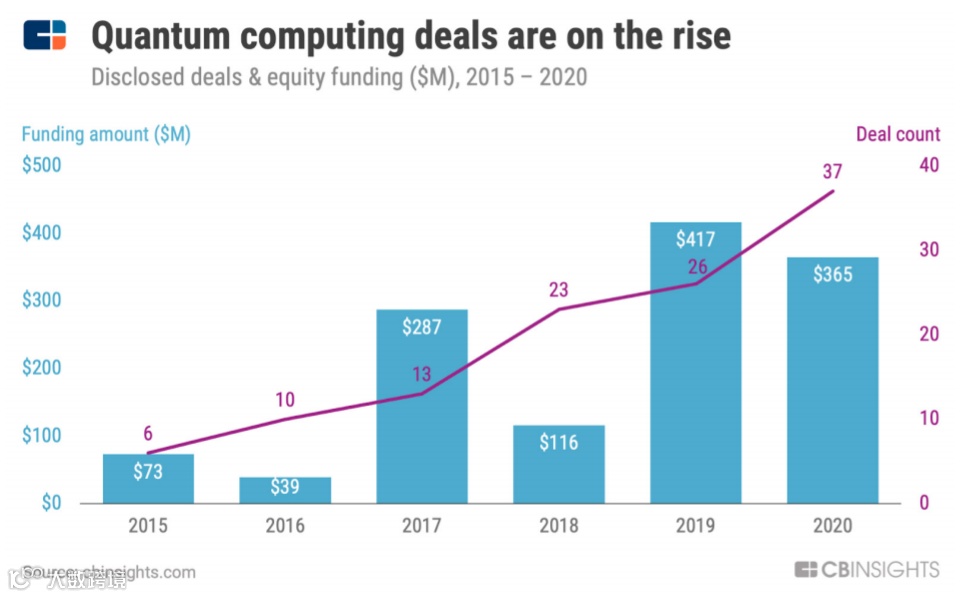 就应用而言,量子计算机在医疗健康、金融和物流等领域将发挥重要的作用,越来越多的企业开始关注到量子计算领域。根据 CB Insights 的数据,2020 年量子计算初创公司的股权交易创下了 37 轮的新纪录,年增长率达到了近 42%。