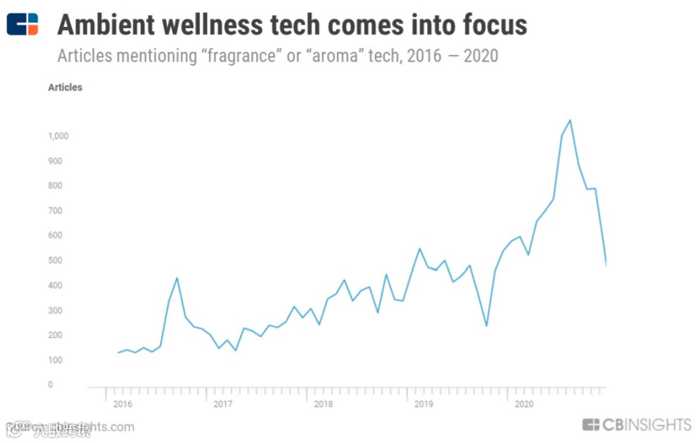 疫情期间,很多消费者都通过香薰来减缓压力,进行自我保健,所以媒体对香水及相关技术的关注呈现出稳步上升趋势。CB Insights 的数据显示,全球香料和香水市场规模可达 528 亿美元。