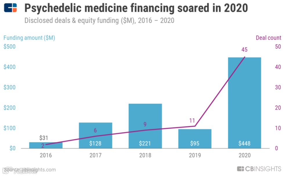 在这种情况下,2021 年,科技公司和制药公司会抓住人们对这类药物改观以及国家政策转变的机会,将这些药物推向市场。与此同时,投资者也在涌入该领域。CB Insights 的数据显示,2020 年,迷幻药物领域初创公司的融资交易数量较 2019 年增长了 4 倍,交易金额增长了近 400%,达到 4.48 亿美元。