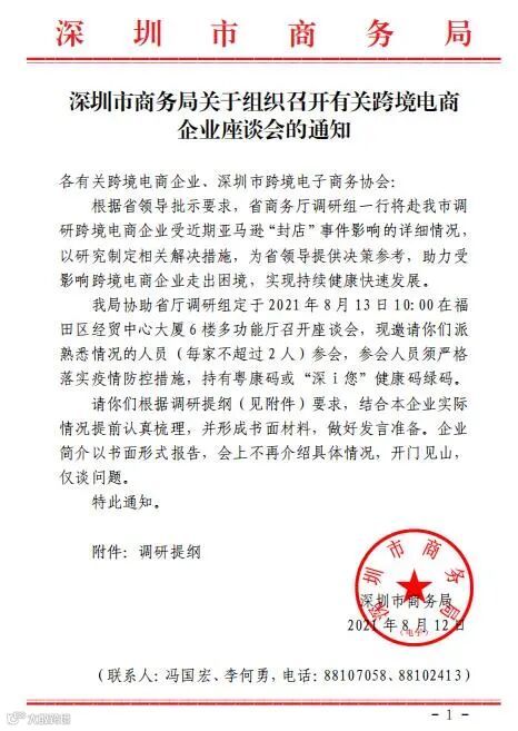 8月13日,深圳市商务局在福田区组织召开了一次跨境电商企业座谈会,就近期深圳亚马逊卖家“封店”事件听取相关企业的汇报,为进一步制定解决措施提供决策参考。