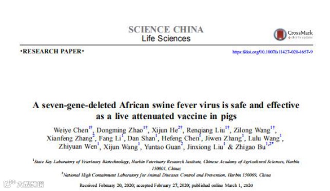 3月1日,中国科学杂志社发布了一篇名为《最新进展!非洲猪瘟疫苗创制成功,向产业化应用迈出坚实一步》的文章,介绍了中国农业科学院哈尔滨兽医研究所在SCIENCE CHINA Life Sciences(《中国科学:生命科学》英文版)发表的一篇题为“A seven-gene-deleted African swine fever virus is safe and effective as a live attenuated vaccine in pigs”的研究论文,该论文报道了一株人工缺失七个基因的非洲猪瘟弱毒活疫苗对家猪具有良好的安全性和有效性,以及具备大规模生产条件。
