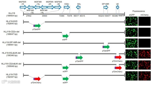 (研究人员构建了6株不同毒力基因缺失的重组病毒,最终筛选出一株具有7个基因缺失的病毒,符合减毒疫苗安全性标准丨A seven-gene-deleted African swine fever virus is safe and effective as a live attenuated vaccine in pigs)
