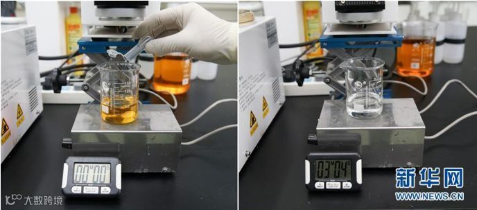 左图:在中科院上海硅酸盐研究所实验室内,课题组研究人员将治污新材料倒入富含大量油污的污水量杯,开始吸附效果时长测试。右图:吸附效果测试结果显示,3分4秒后,量杯中的污水由明黄色变清澈,刺激气味随之消失。
