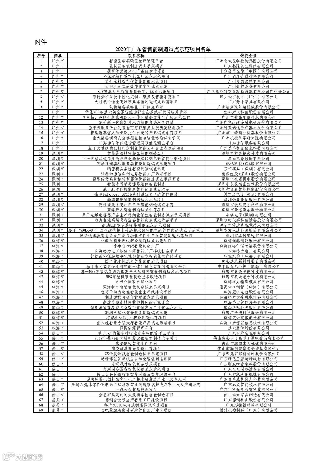 【通知公告】广东省工业和信息化厅关于公布 2020 年 广东省智能制造试点示范项目的通知
