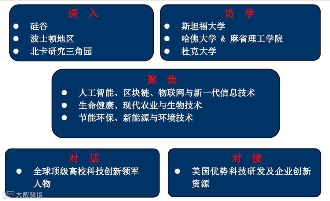 考察横跨美国东西两岸,深入美国三大高科技地区;研修之余,还将参访美国政治中心华盛顿和金融中心纽约,以及美国独立精神象征的费城,立体感受美国政治、经济、文化及科技全貌。