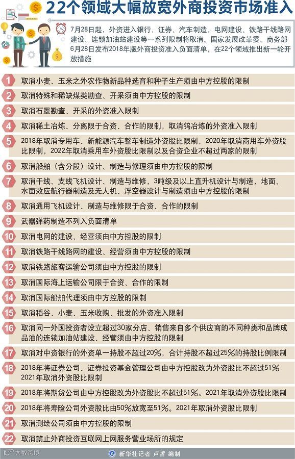 国家发展改革委、商务部28日发布2018年版外商投资准入负面清单,在22个领域推出新一轮开放措施。7月28日起,外资进入银行、证券、汽车制造、电网建设、铁路干线路网建设、连锁加油站建设等一系列限制将取消。