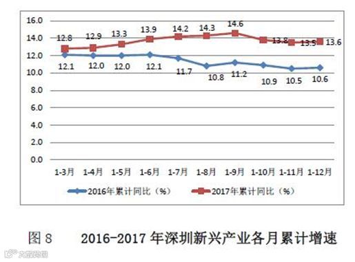 科技企业创新成为深圳经济坚实的增长动力。根据深圳市统计局最新数据,全年全市新兴产业(七大战略性新兴产业和四大未来产业)的产值占到了深圳市GDP的41%。其中,新一代信息技术产业增加值4592.85亿元,增长12.5%;互联网产业增加值1022.75亿元,增长23.4%;新材料产业增加值454.15亿元,增长15.1%;生物产业增加值295.94亿元,增长24.6%;新能源产业增加值676.40亿元,增长15.4%;节能环保产业增加值671.10亿元,增长12.7%;文化创意产业增加值2243.95亿元,增长14.5%;海洋产业增加值401.45亿元,增长13.1%;航空航天产业增加值146.64亿元,增长30.5%;机器人、可穿戴设备和智能装备产业增加值639.64亿元,增长15.1%;生命健康产业增加值98.12亿元,增长19.5%。