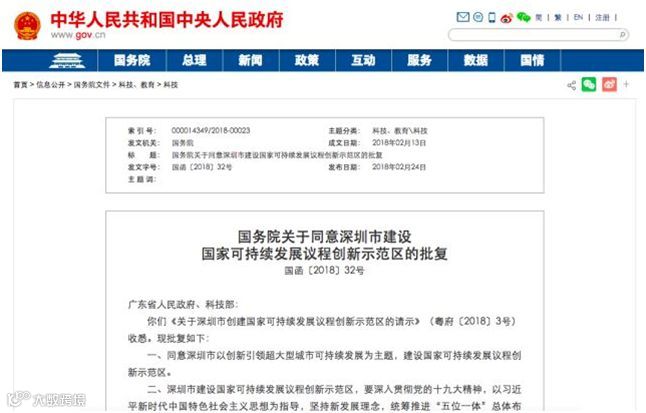 新春伊始,深圳接连收到好消息!首先,2月24日国务院发布2018年2月13日对广东省人民政府和科技部《关于深圳市创建国家可持续发展议程创新示范区的请示》(粤府〔2018〕3号)作出批复,同意深圳市以创新引领超大型城市可持续发展为主题,建设国家可持续发展议程创新示范区。从2016年国务院发公文开始,全国诸多城市都在申报该示范区,但第一批获批的城市只有深圳、太原和桂林。