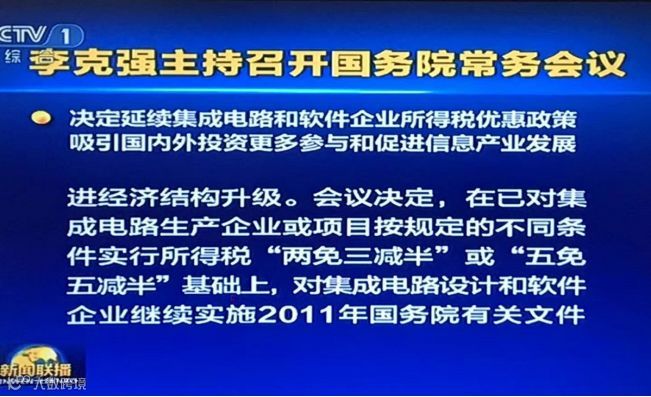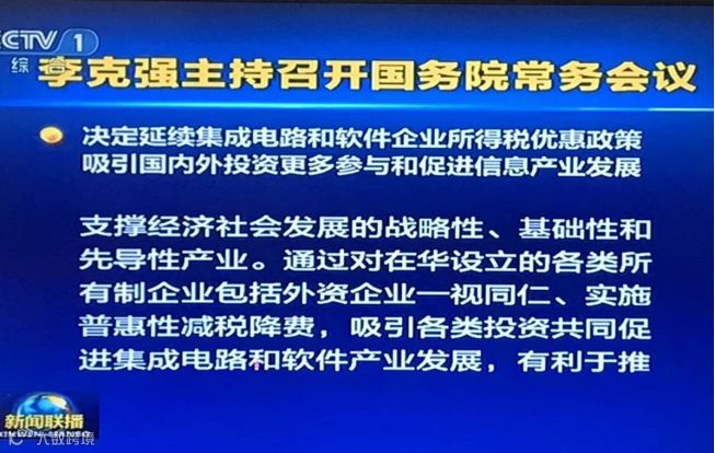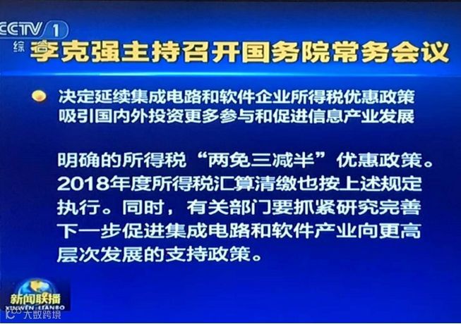 会议决定,在已对集成电路生产企业或项目按规定的不同条件分别实行企业所得税“两免三减半”(即第一年至第二年免征、第三年至第五年减半征收)或“五免五减半”(即第一年至第五年免征、第六年至第十年减半征收)的基础上,对集成电路设计和软件企业继续实施2011年《国务院关于印发进一步鼓励软件产业和集成电路产业发展若干政策的通知》中明确的所得税“两免三减半”优惠政策。2018年度所得税汇算清缴也按上述规定执行。同时,有关部门要抓紧研究完善下一步促进集成电路和软件产业向更高层次发展的支持政策。
