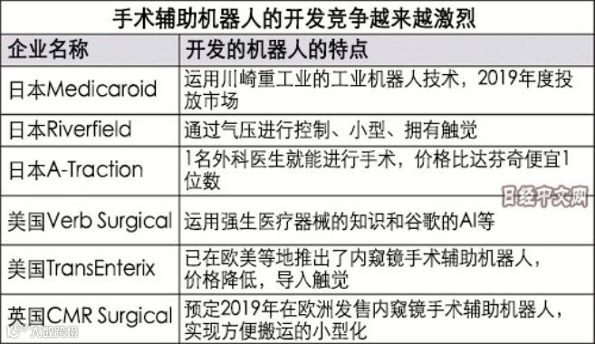 在日本,川崎重工业与希森美康对半出资的Medicaroid想要打头阵。该公司计划2019年度在日本市场投放基本构造和动作与达芬奇手术机器人相似的手术机器人,似乎正在与审查部门讨论相关事宜。
