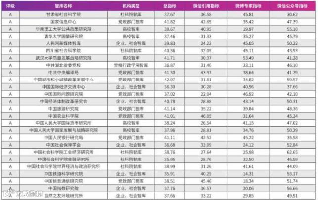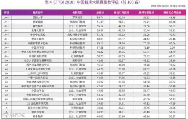 《清华大学智库大数据报告(2018)》的“中国智库大数据模块”评价了归属七种类别的1065家中国智库。中国智库行为的源数据来自于20万个网站、2100万个活跃微信公众号、2.5亿个活跃微博账户、6155个论坛和307个主流新闻类APP构成的基础大数据平台。以1065家智库的全称和简称作为关键词在基础数据库平台进行初步检索,经过识别、清洗和匹配等技术环节处理,最终获得中国智库在社交媒体上的三类源数据集:中国智库在腾讯微信平台上运营的官方微信公众号的账户信息及发文信息;中国智库在全部微信空间中被提及或引用的文章及其文章信息;中国智库专家在新浪微博平台中的专家账户信息和发文信息。基于中国智库大数据行为的三类源数据集,报告构建了由中国智库微信引用影响力、中国智库微博专家影响力和中国智库微信公号影响力三个一级指标和若干二级指标所组成的“中国智库大数据指数(2018)”(Chinese Think Tank Big-Data Index,CTTBI 2018)。报告分别评价了中国智库大数据影响力、中国智库微信引用影响力、中国智库微博专家影响力和中国智库微信公号影响力,并发布了中国智库前100名智库的四个指数评级。2018年,中国智库大数据指数(CTTBI)评级为A++机构有(按名称首字母排序):国防大学、瞭望智库、盘古智库、全球化智库、中共中央党校、中国工程院、中国科学技术协会、中国科学院、中国人民大学重阳金融研究院和中国社会科学院等。