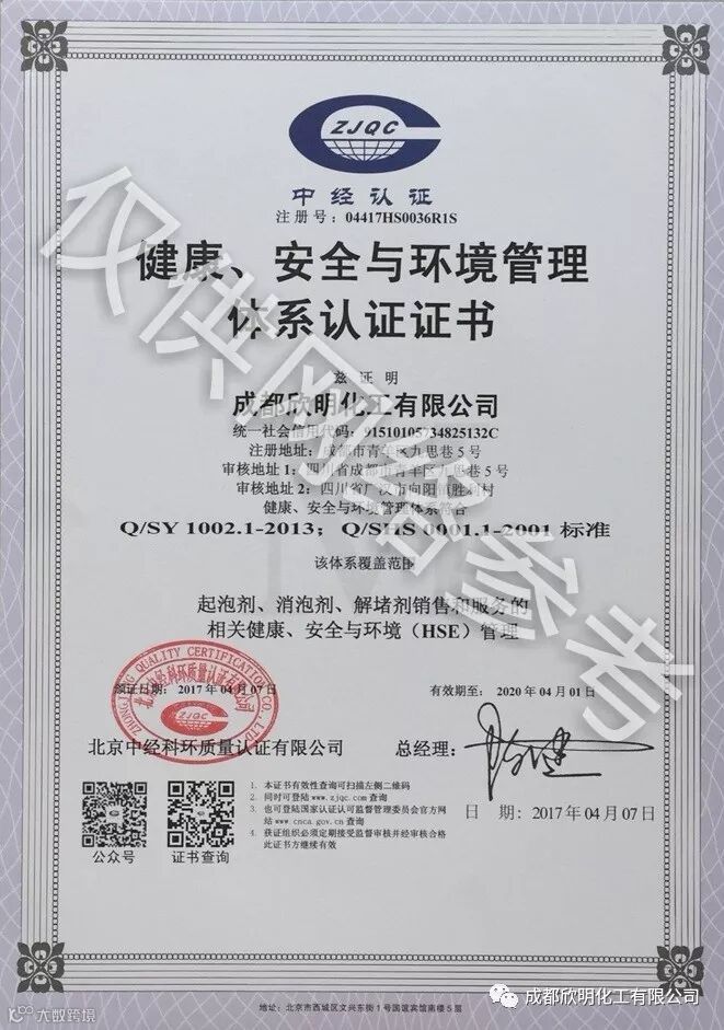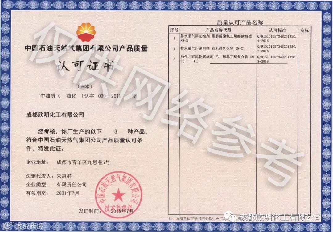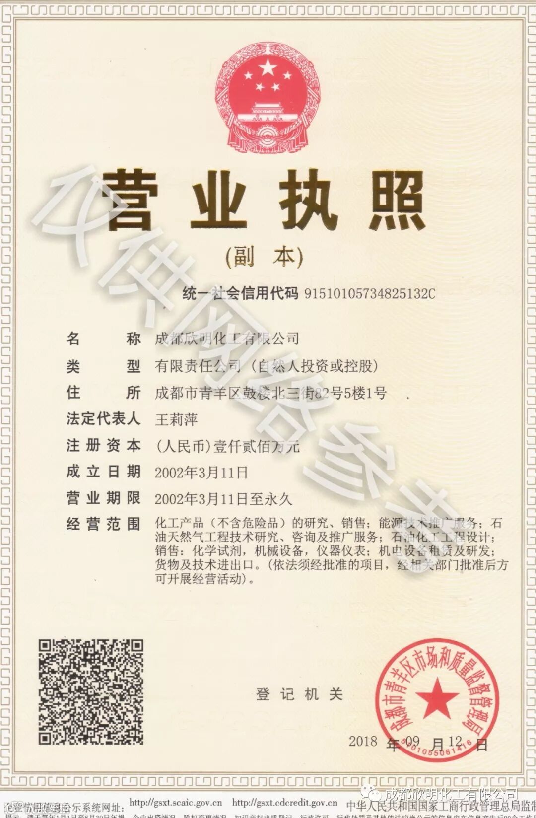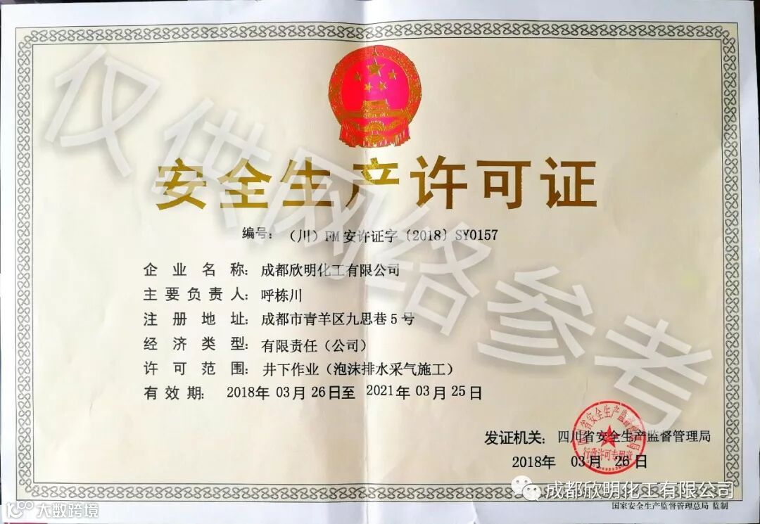 成都欣明化工有限公司业务以气田开发服务为主,具有相关资质,技术,设备和产品。公司始终坚持用户要求至上和注重工程的安全、环保、质量。公司经营范围:化工产品(不含危险品)的研究,销售;能源技术推广服务;石油天然气工程技术研究;咨询及推广服务;石油化工工程设计,施工;销售(化学试剂,机械设备,仪器仪表;机电设备租赁及研发;货物及技术进出口) 。技术服务:除垢挖潜,油管解堵,储层解水锁,泡沫排水采气,气藏动态监测,液面探测;销售:起泡剂,解堵剂,消泡剂,解水锁剂,储层改造剂,泡排棒等: