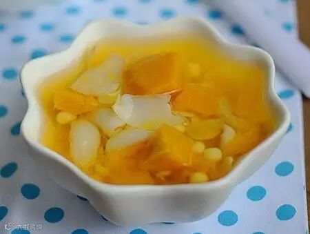 南瓜百合糖水:薏米加水煲汤30分钟,再加入南瓜煲25分钟,最后加入百合煮5分钟,关火,加适当冰糖,放凉。