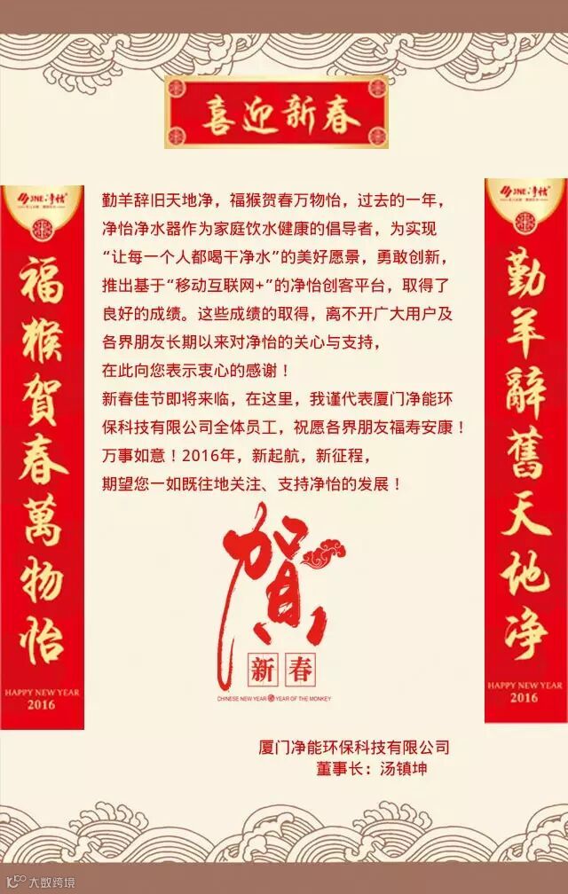导读:勤羊辞旧天地净,福猴贺春万物怡,净怡净水器在这里祝大家新年快乐。开心过大年!