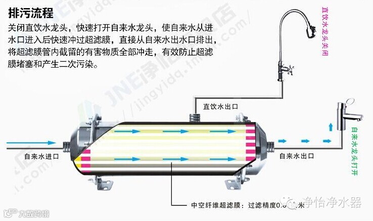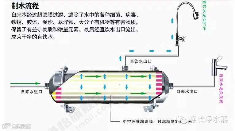 管道超滤净水器中起到过滤作用的就是超滤膜,由于超滤膜上面的微孔直径只有0.01微米,当自来水流经超滤膜的时候,泥沙、铁锈、细菌以及大分子物质会被拦截下来,而水中的矿物元素则被保留下来了。