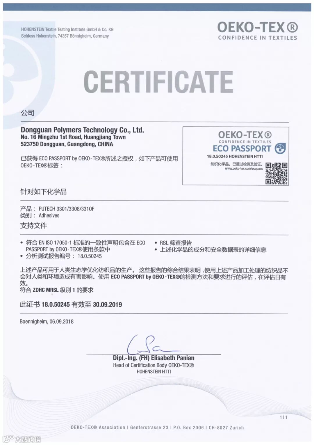聚力创科技在2018年9月通过了Oeko-Tex Standard 100标准,满足客户对应用于纺织行业反应型聚氨酯热熔胶的严格要求。