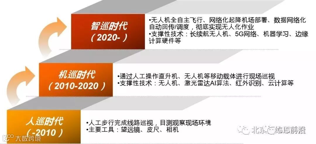 无人机的使用帮助巡检班组人员提高了巡检效率,但是新的工作方式也带来了新的挑战。无人机巡检需要对无人机长时间的飞行控制操作,这对于基层班组人员的无人机操作技能要求可不低。“炸机”、“撞塔”等事故的发生也随着机巡业务的扩大而与日俱增。在安全飞行的前提下,同一条线路在高手和新手飞过以后也可能产生迥异的巡视结论。行业迫切需要更加智能、更加安全、更加可控的巡检作业方式。降低无人机操作门槛,降低人员经验对于巡检工作的影响,进一步提升机巡作业效率,必将成为业界追随的技术趋势。“无人机全自主飞行”、“网络化起降机场”、“机器学习”、“边缘计算硬件”等新一代技术的攻克,将翻开电网巡检的下一篇章:智巡时代(见图1)。