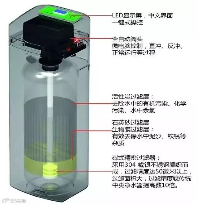 中央净水器的原理:它采用KDF处理系统和高级活性炭滤芯,去除自来水中的泥沙、浑浊物、悬浮物、余氯、氯胺、重金属、农药、杀虫剂、除草剂等杂质、有害化学物质及有机污染物。将自来水过滤成适合于厨房的饮用水和沐浴的净水。