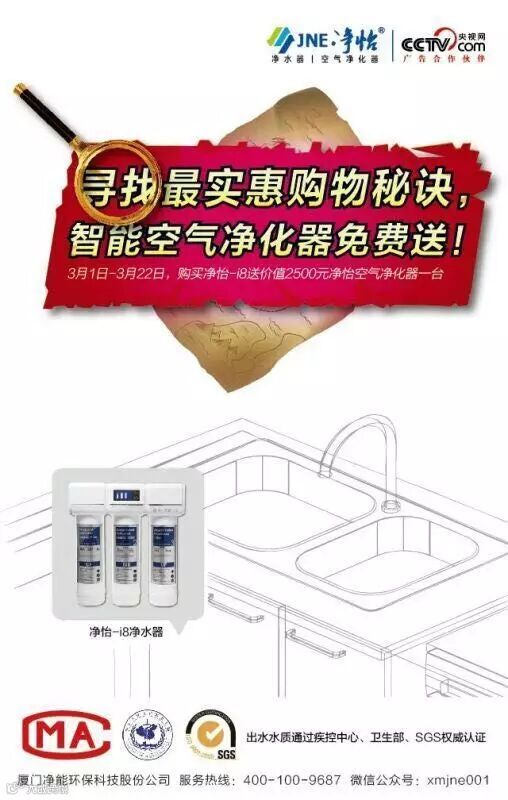 3月1日——3月22日,凡购买净怡—i8净水器即送价值2868的前置过滤器或价值2500元的空气净化器一台。