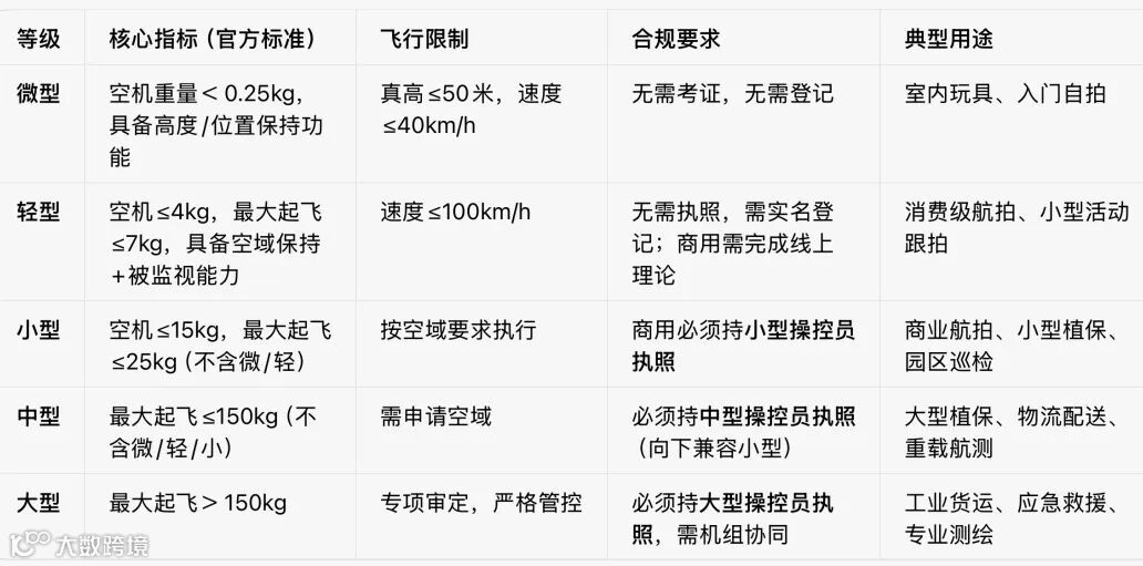 这是国家明确的分级标准,直接决定你是否需要考证、能飞多高多快,精准对应如下: