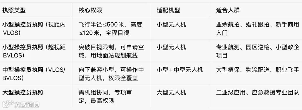很多消费级机型标注“小型航拍机”,实际属于“轻型”(最大起飞<7kg),个人使用无需考证,商用需完成线上理论。