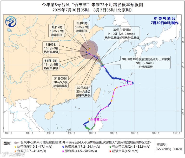 根据中央气象台消息,今年第8号台风“竹节草”(热带风暴级)的中心已于今天(7月30日)早晨4点30分前后在浙江省舟山市朱家尖岛沿海登陆,登陆时中心附近最大风力有9级(23米/秒),中心最低气压为975百帕。